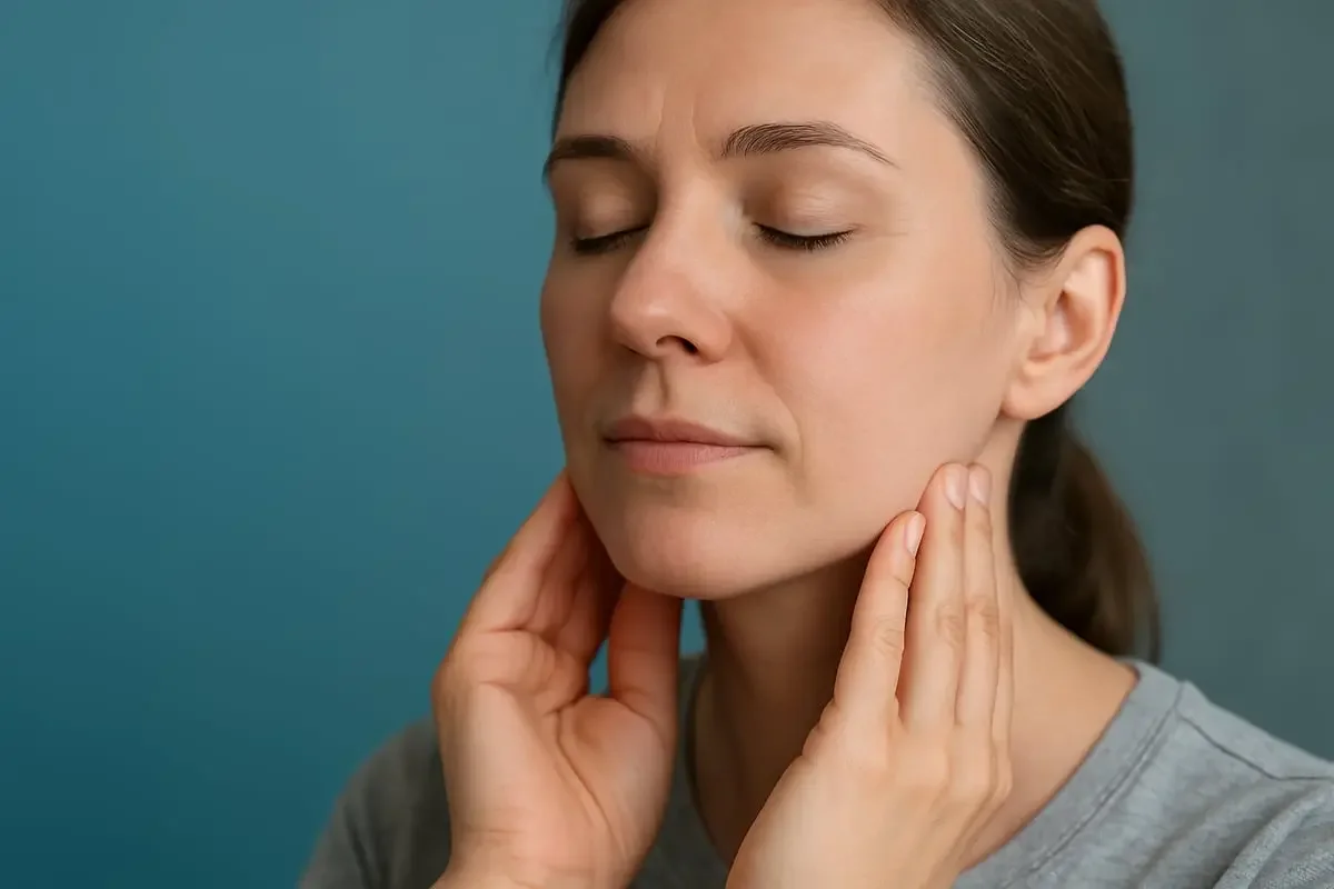 Superficial jaw tension often responds well to a circular cheek TMJ massage. Use your palms or fingertips to make large, gentle circles over the cheeks and jawline.