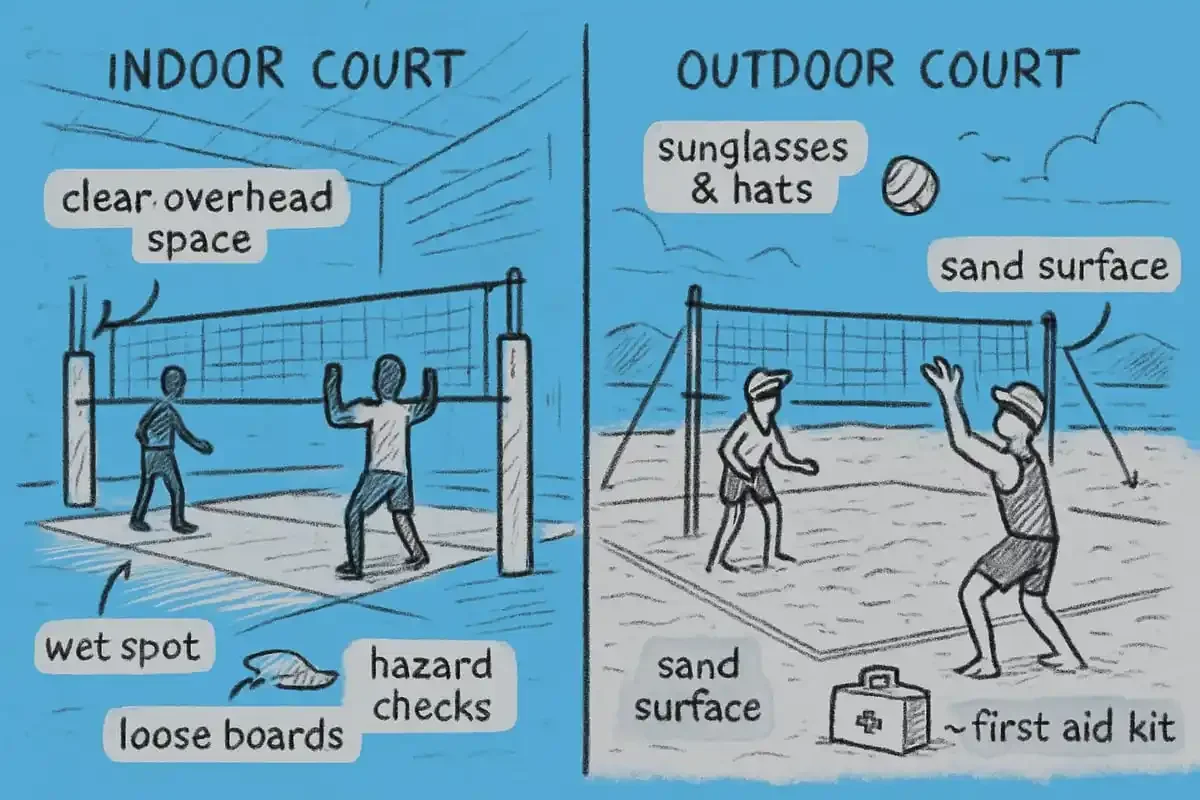 Playing indoors or outdoors brings different risks. Indoor courts might have a poor court surface that doesn't allow sliding while trying to dig, while outdoor sand courts could hide debris. Year-round play or insufficient rest boosts injury risk, too.